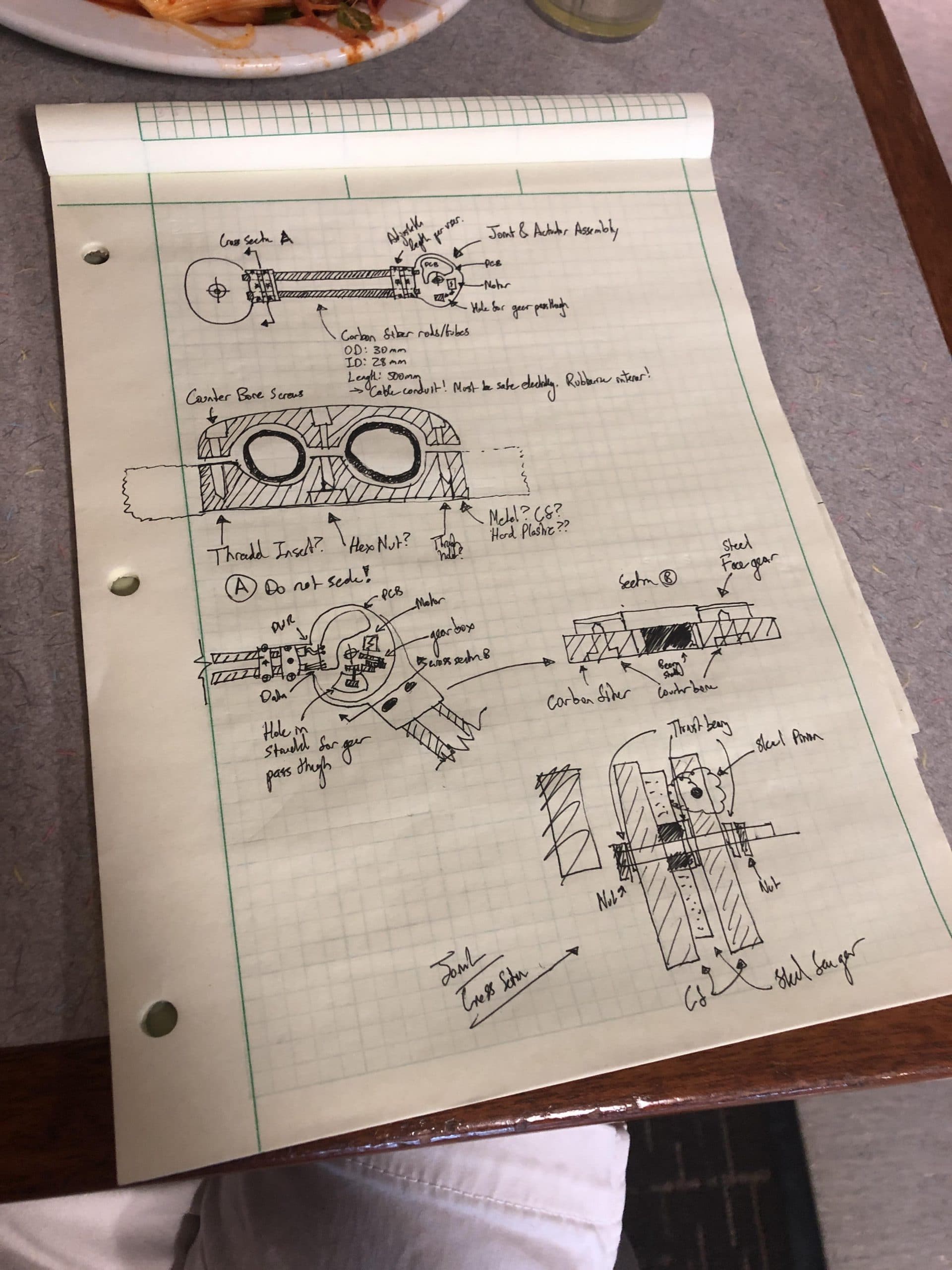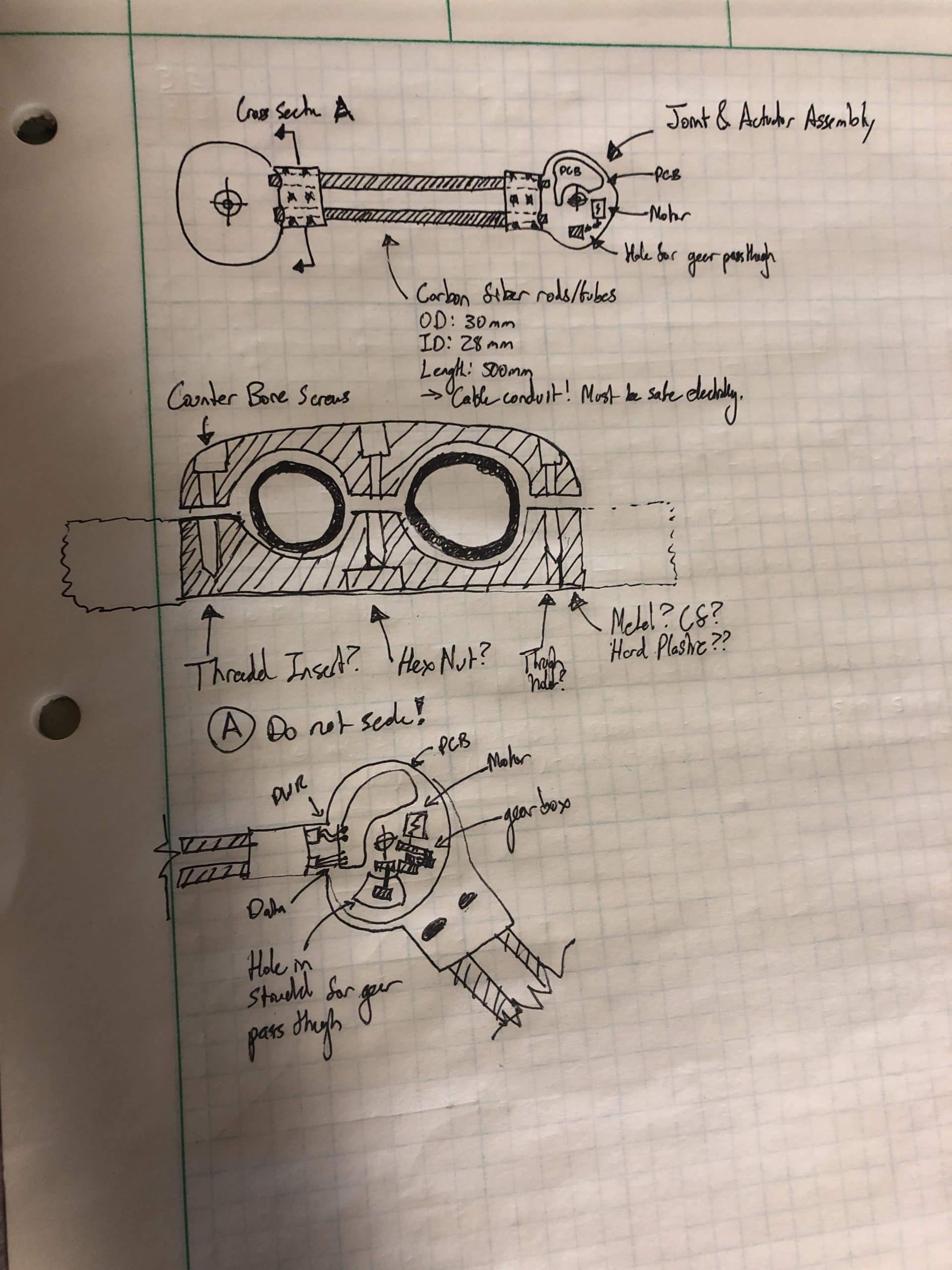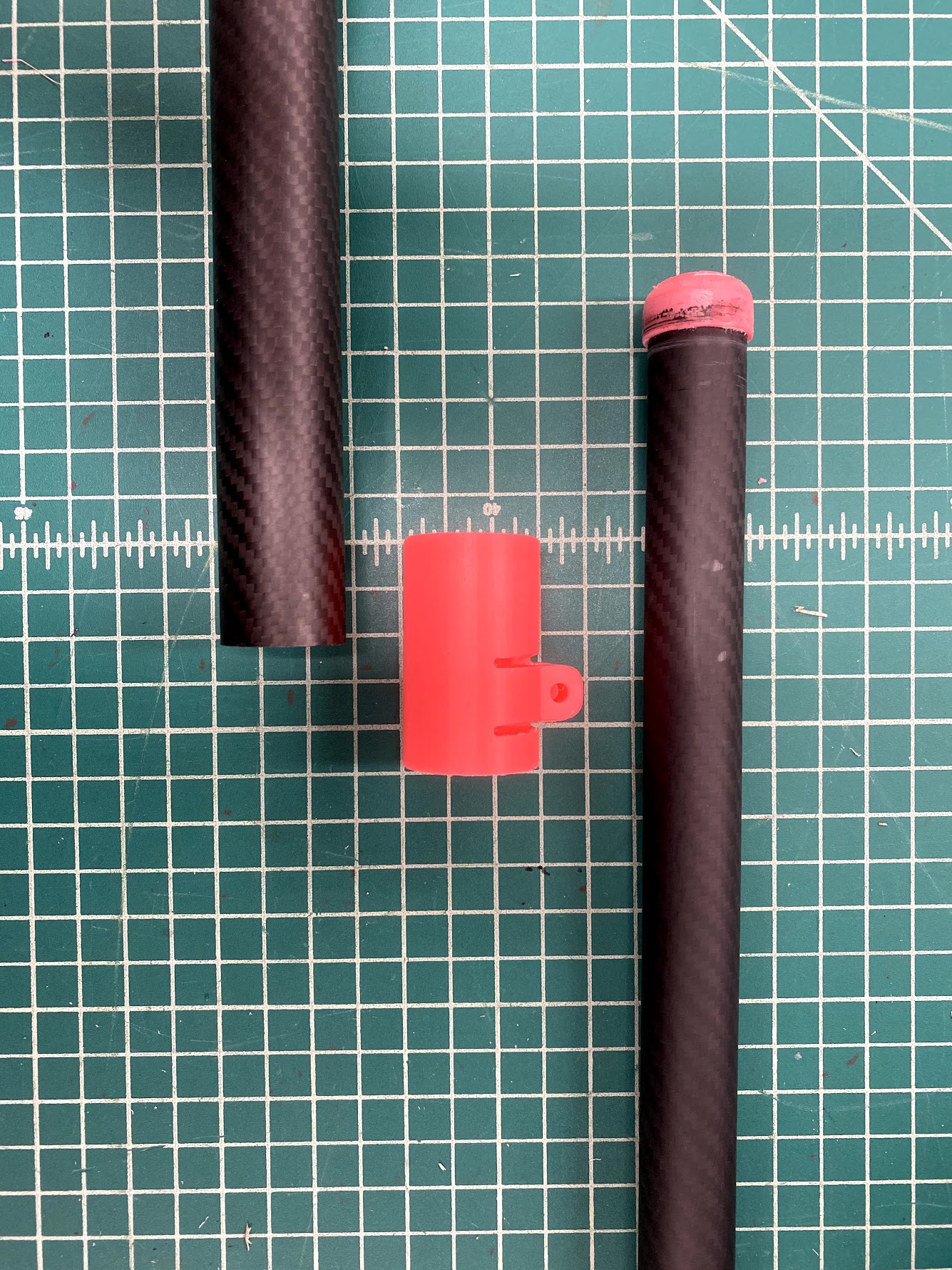 - Concept – what if I spec DC motors 28mm OD to fit INSIDE the CF tubes. What if I also draw my PCB to fit inside the tubes? Natural RF blocking by the CF and it makes the assembly easier to seal and waterproof.