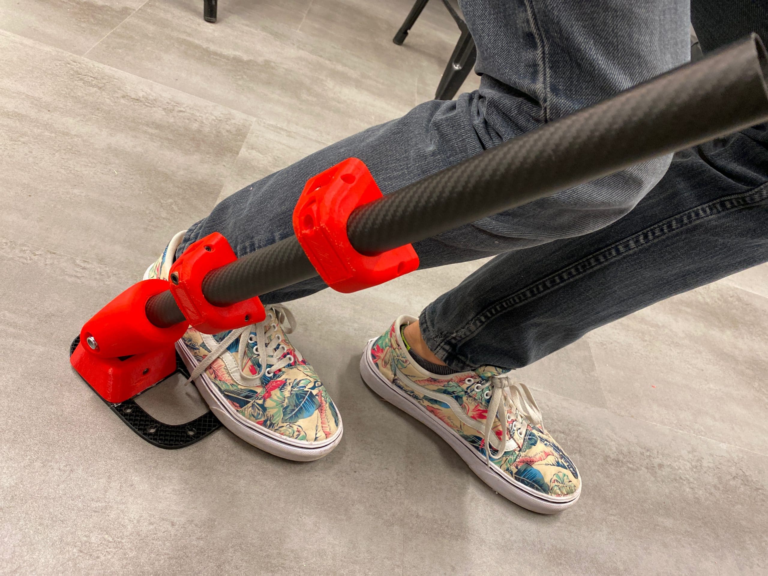 - The original design I envisioned for the frame was substantially overbuilt. I preserved many of its innovative features in my revised design:\r\n\r\nShifting to a single carbon fiber tube resulted in a volumetric reduction. In this revision, three versions of the \”Tube Mount\” are depicted – a power and data cable slot, a gearbox mount (featuring the 180mm wide thigh pad), and a mid tube mount (featuring the 150mm wide thigh pad). The thigh pad parts will later feature a washable, neoprene cover to ensure operator comfort as well as thermal insulation from the plastic and carbon fiber parts which can get cold.