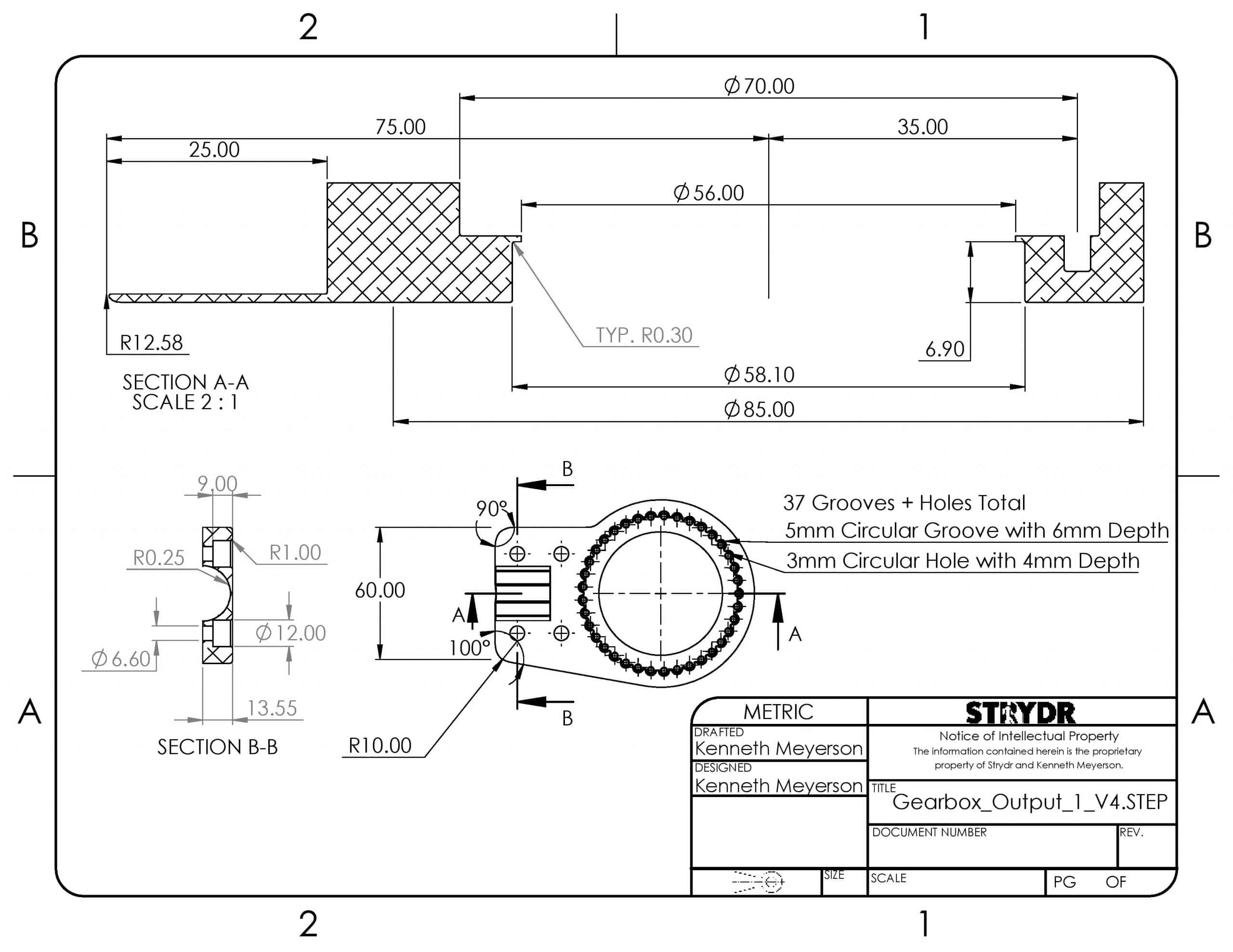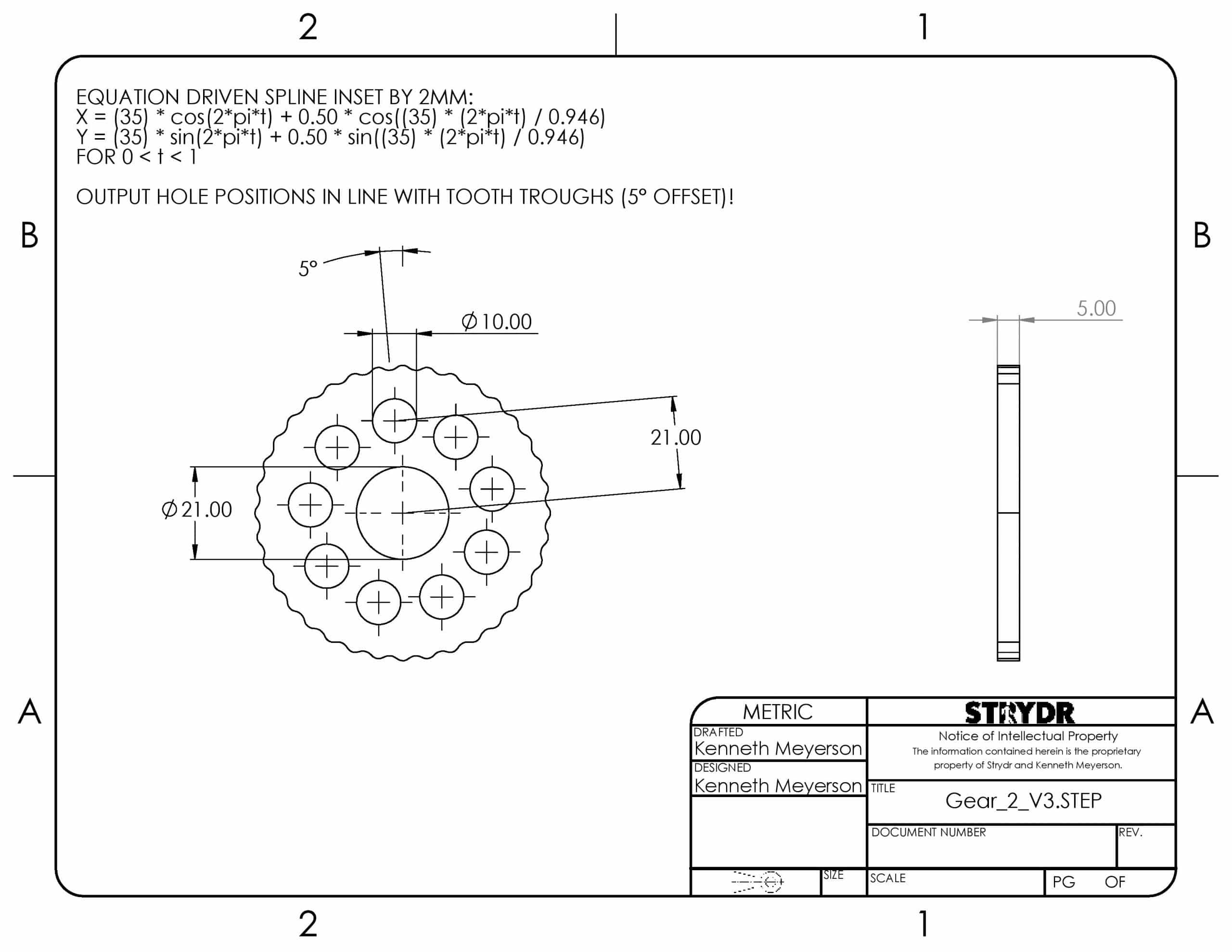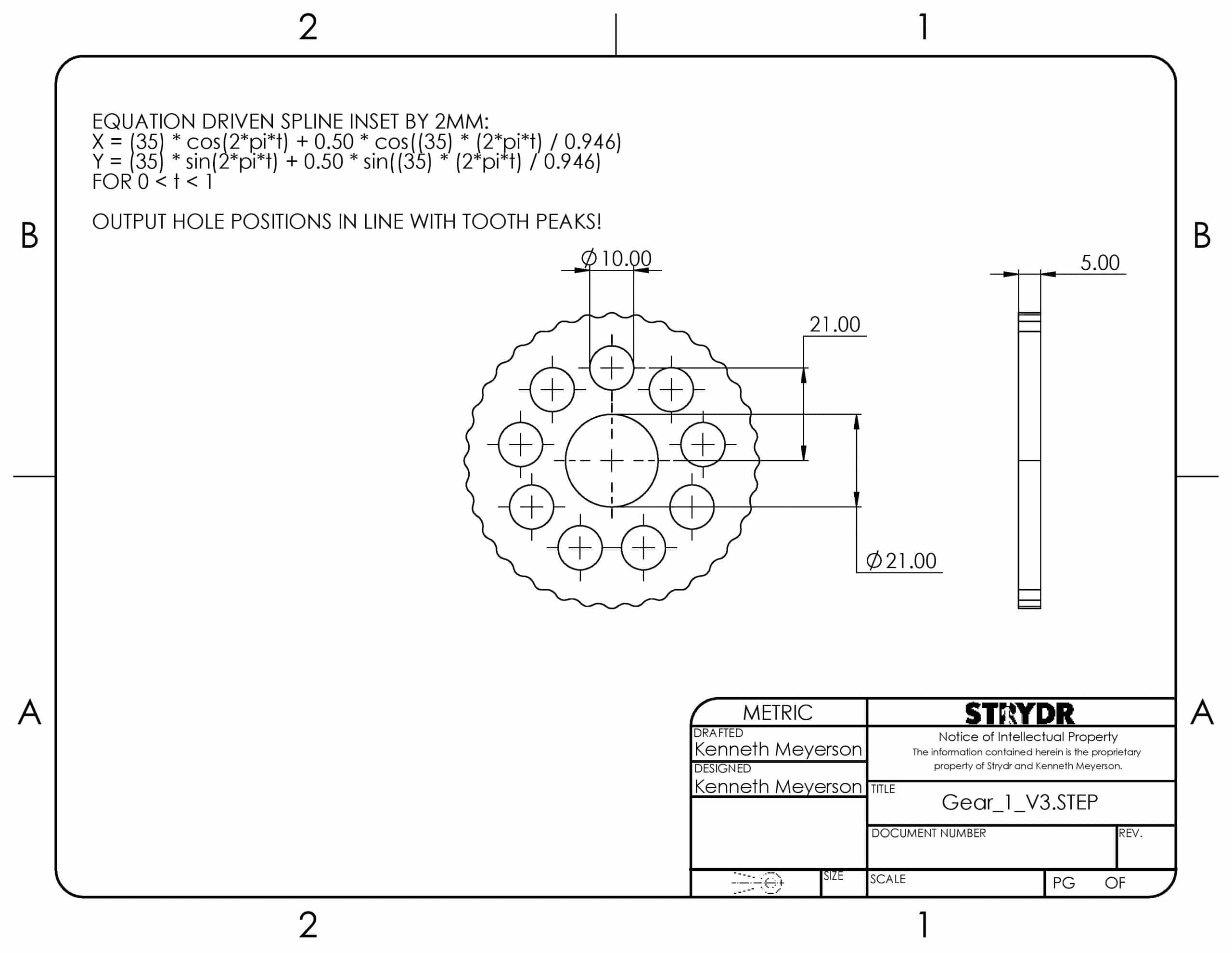 - Placed output holes in line with the peaks or troughs of the gear for Top and bottom. This geometry was not fully constrained previously due to software limitations with equation drive splines.