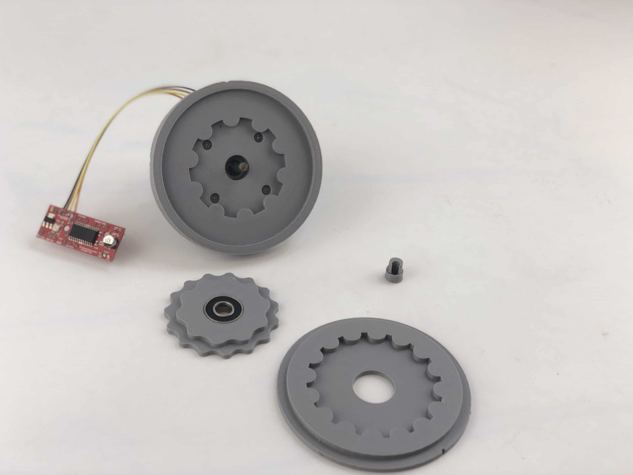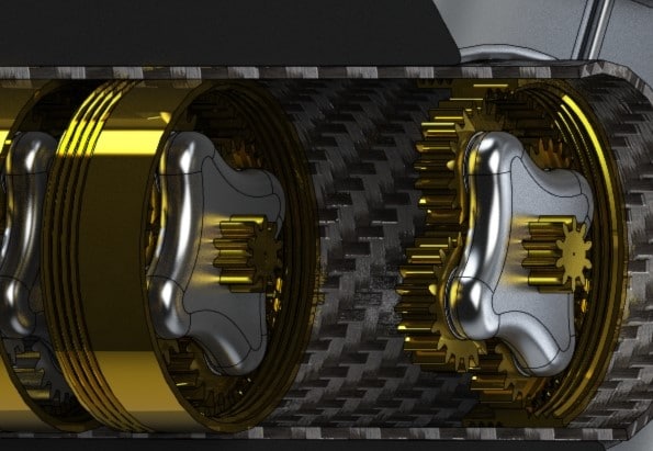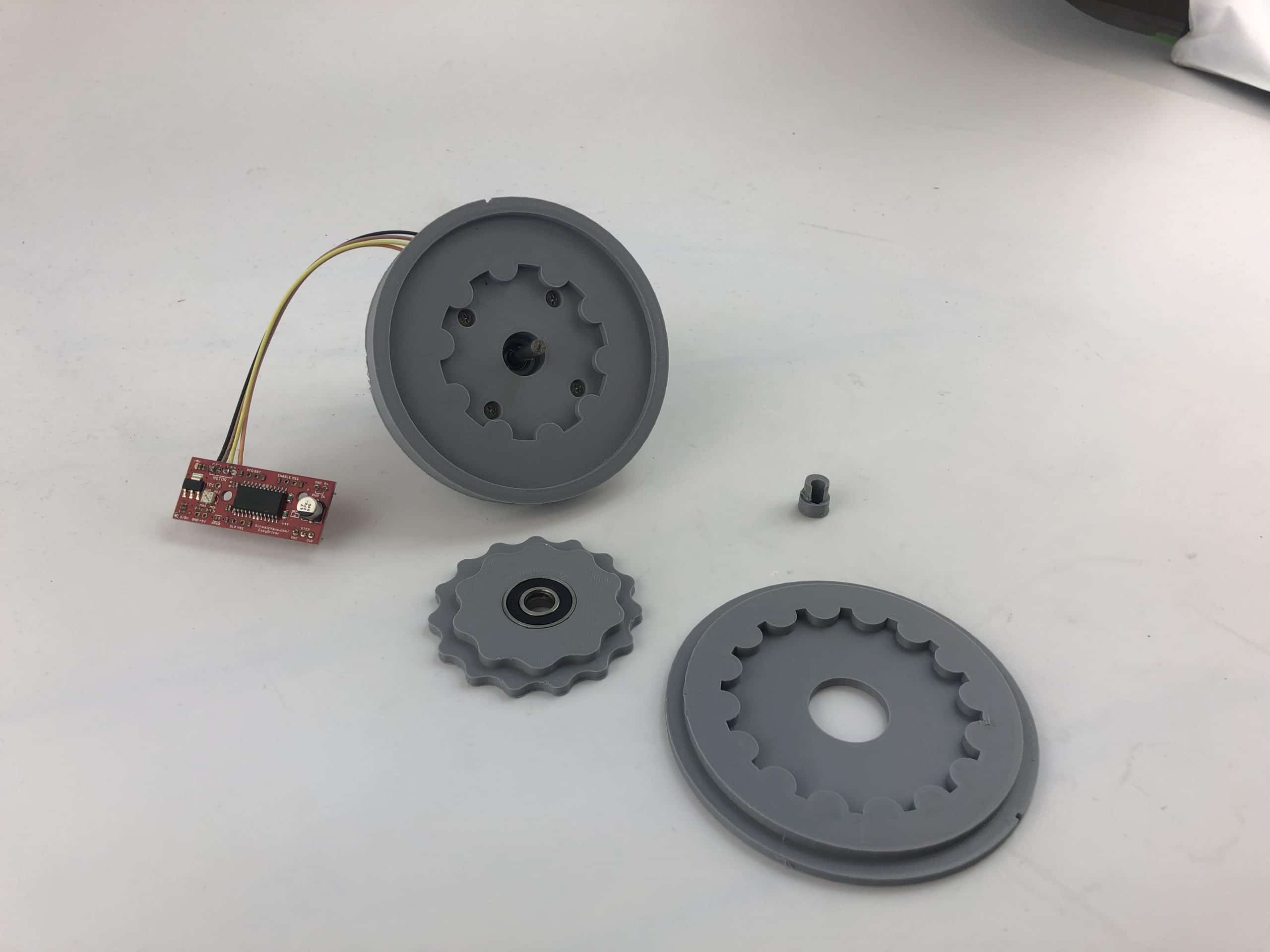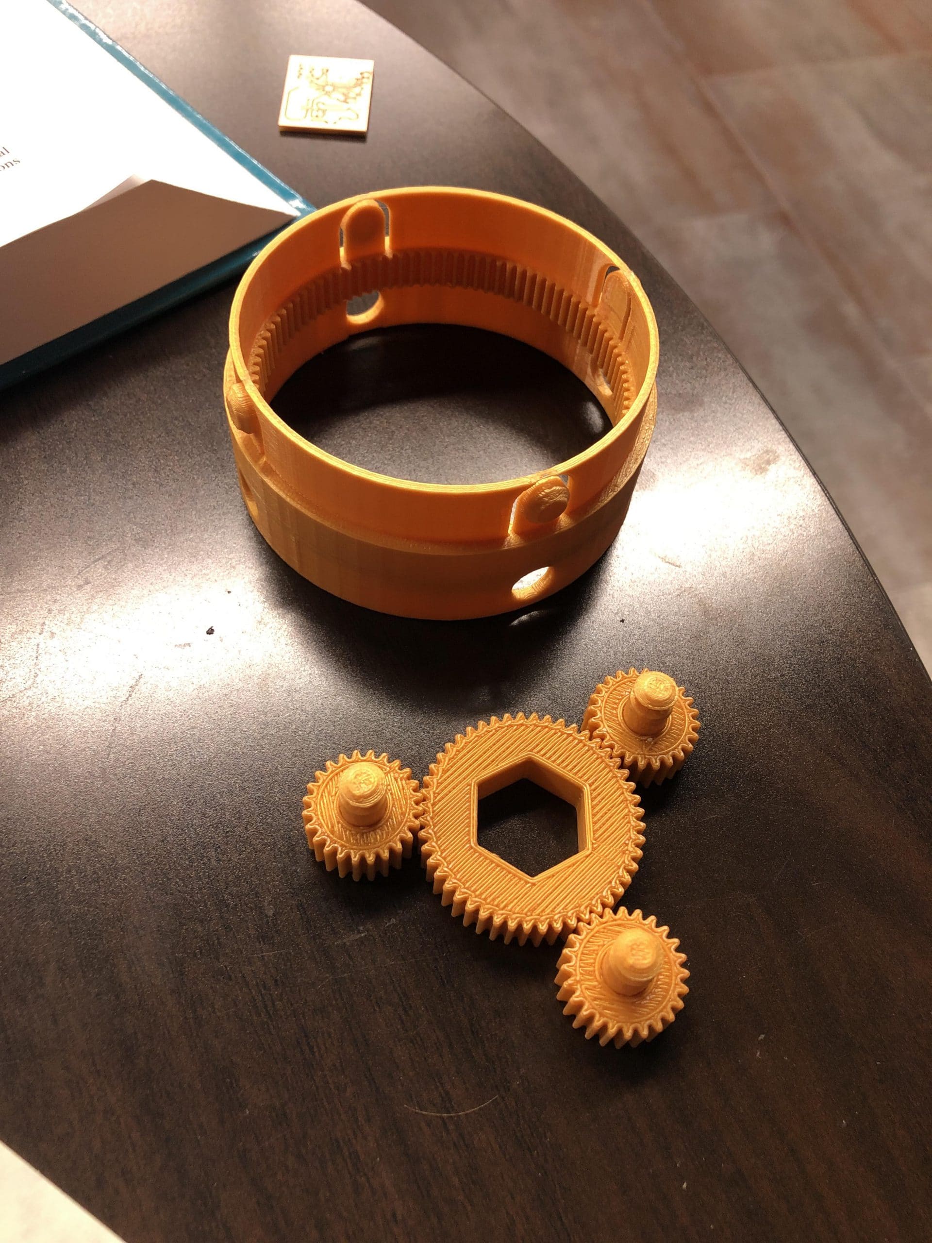 The major change incurred by the adaptation is the replacement of the previously laser cut outer gear rings with 37 independent support pins and rolling sleeves. This change eliminates the sliding friction with rolling friction to minimize fictional losses and maximize silence. Smaller changes replacing the small bearings connecting the gears with the output shaft with brass bushings. This minimizes the BOM cost, simplifies assembly, and improves durability.