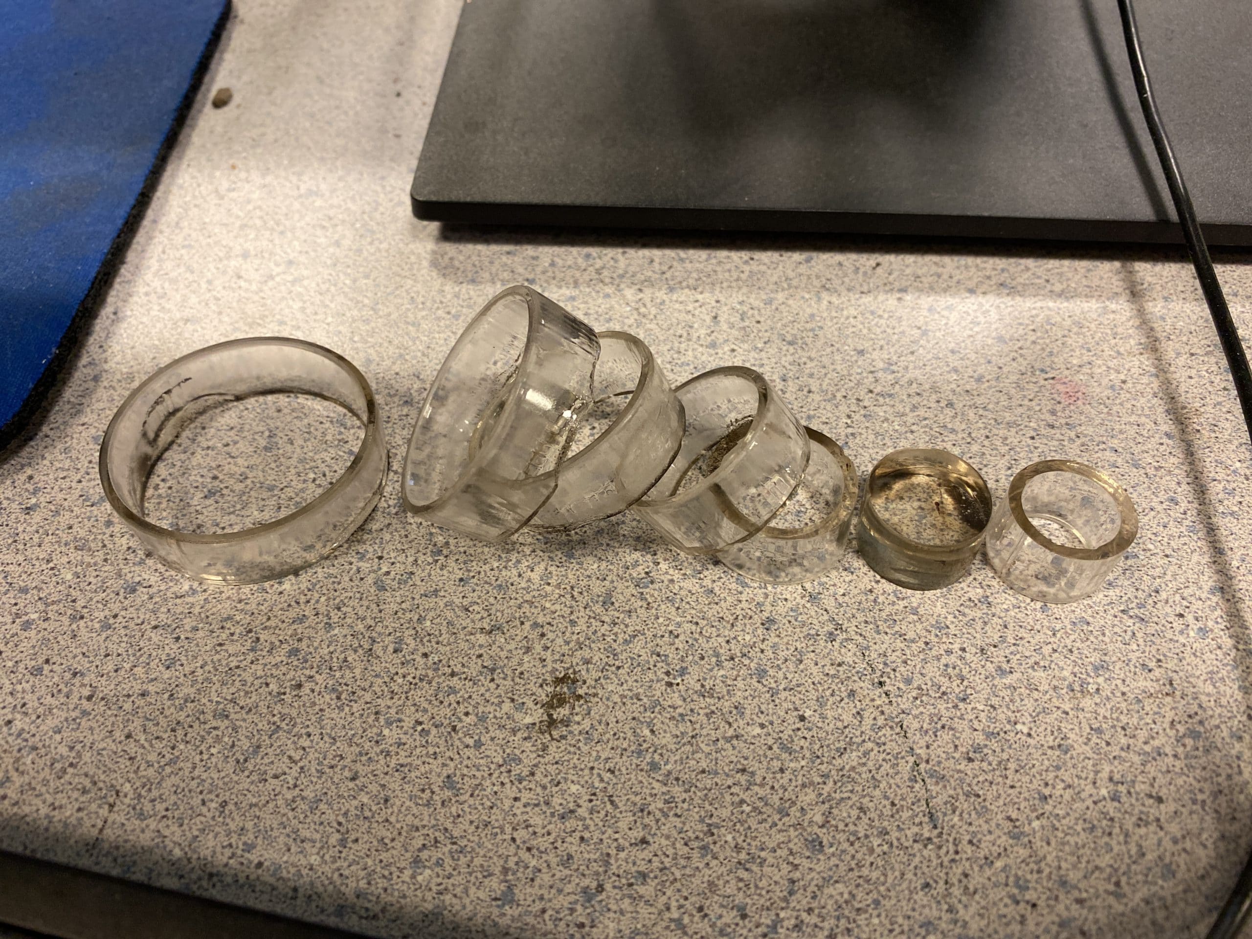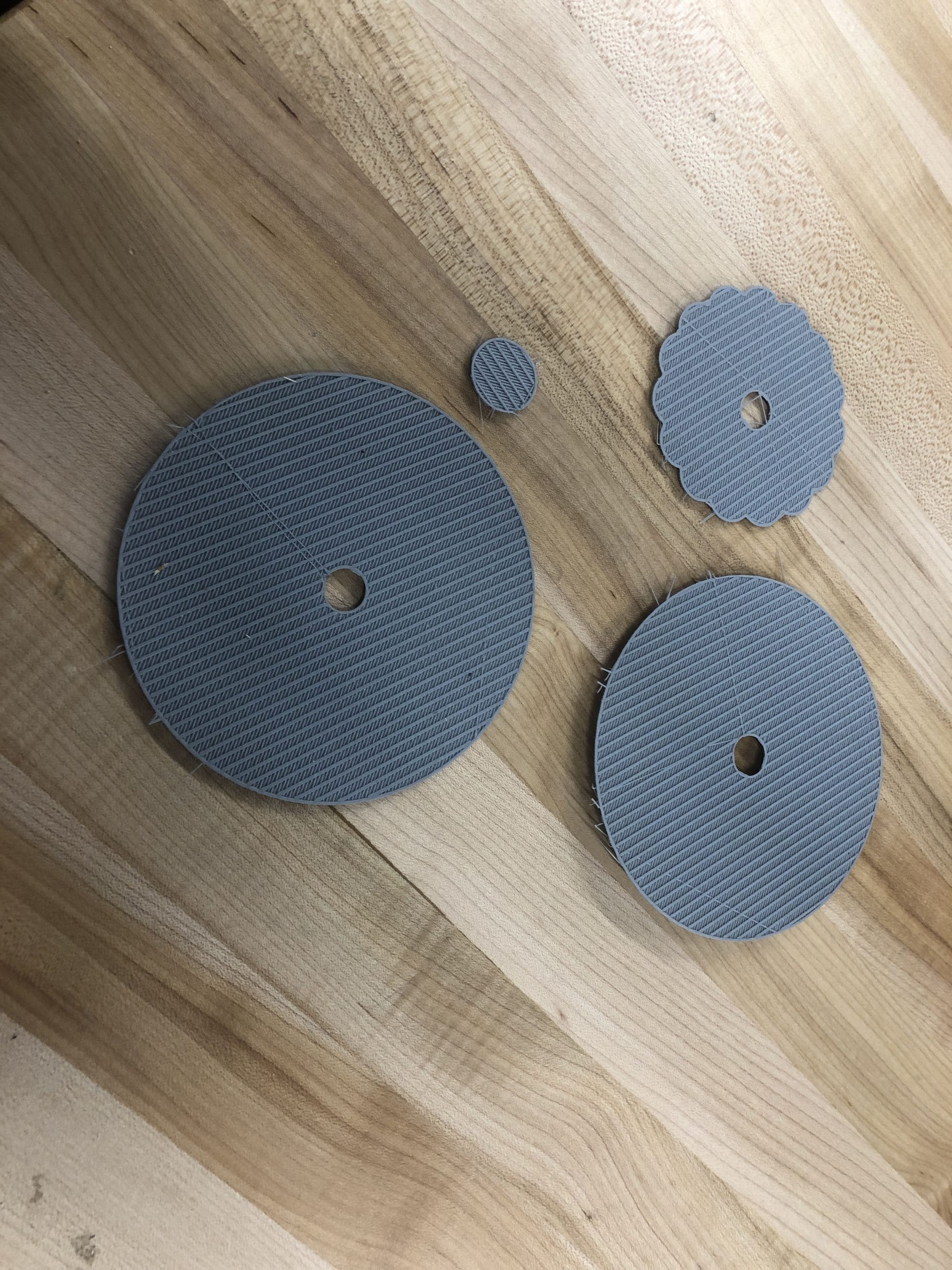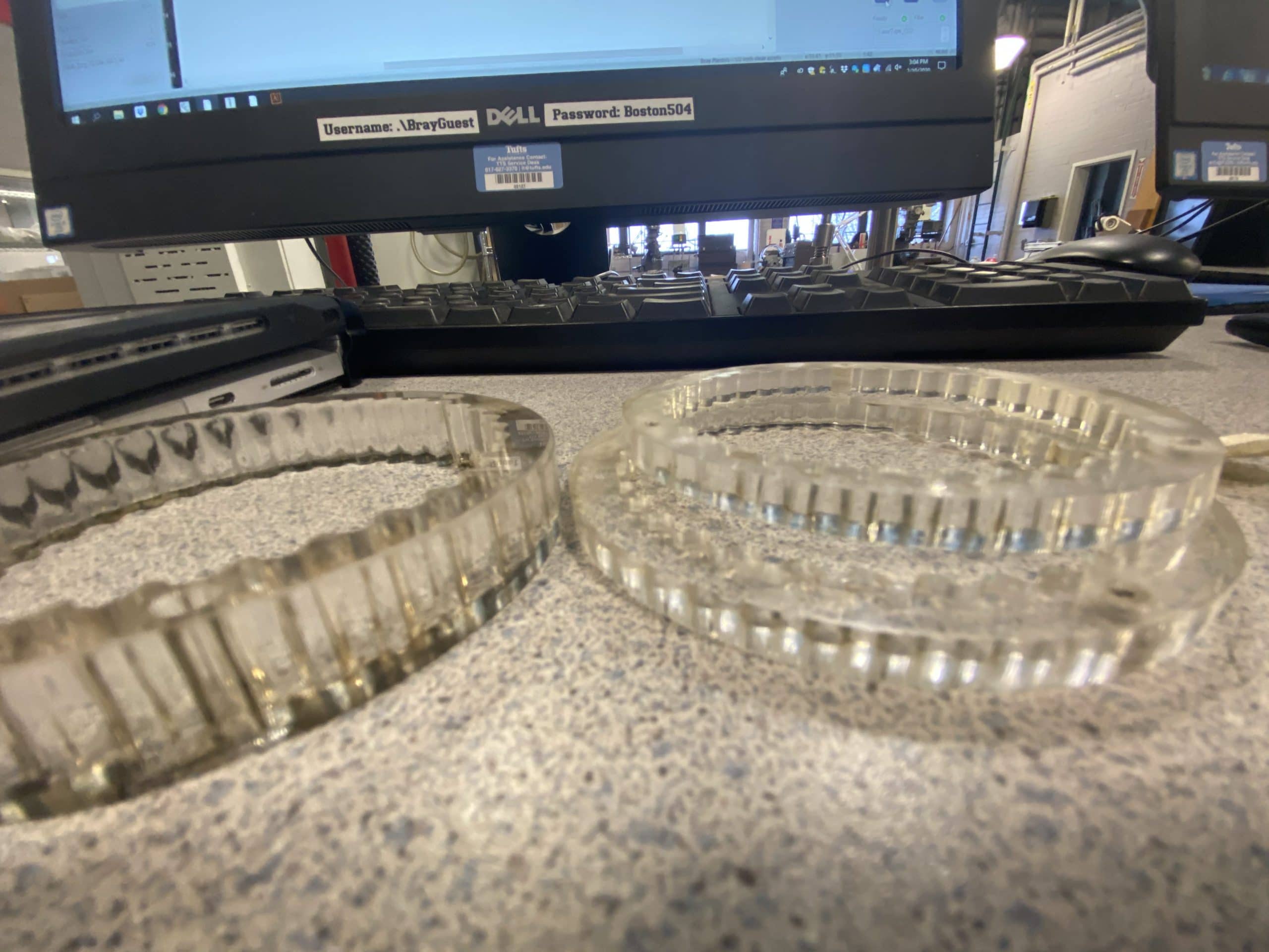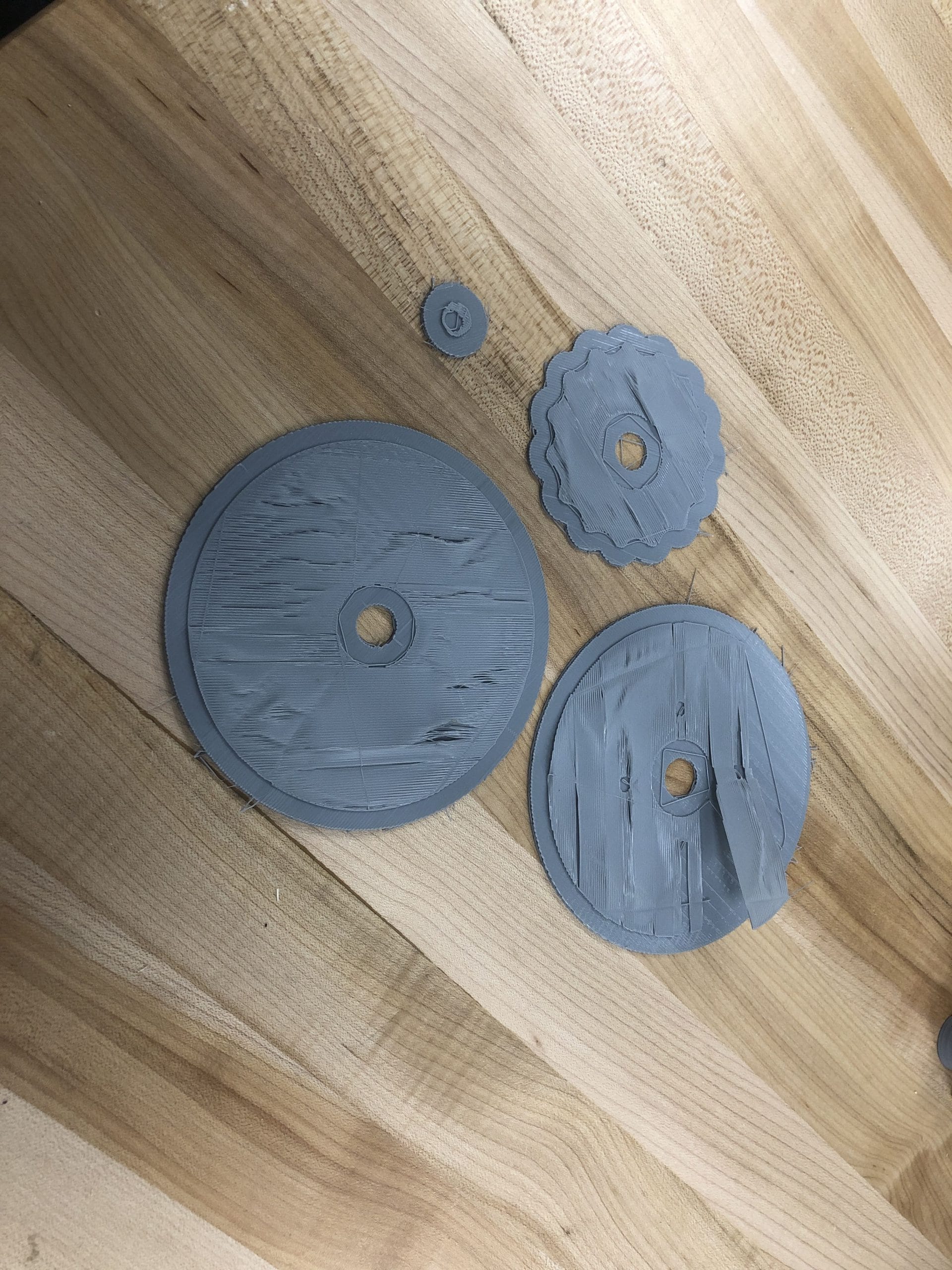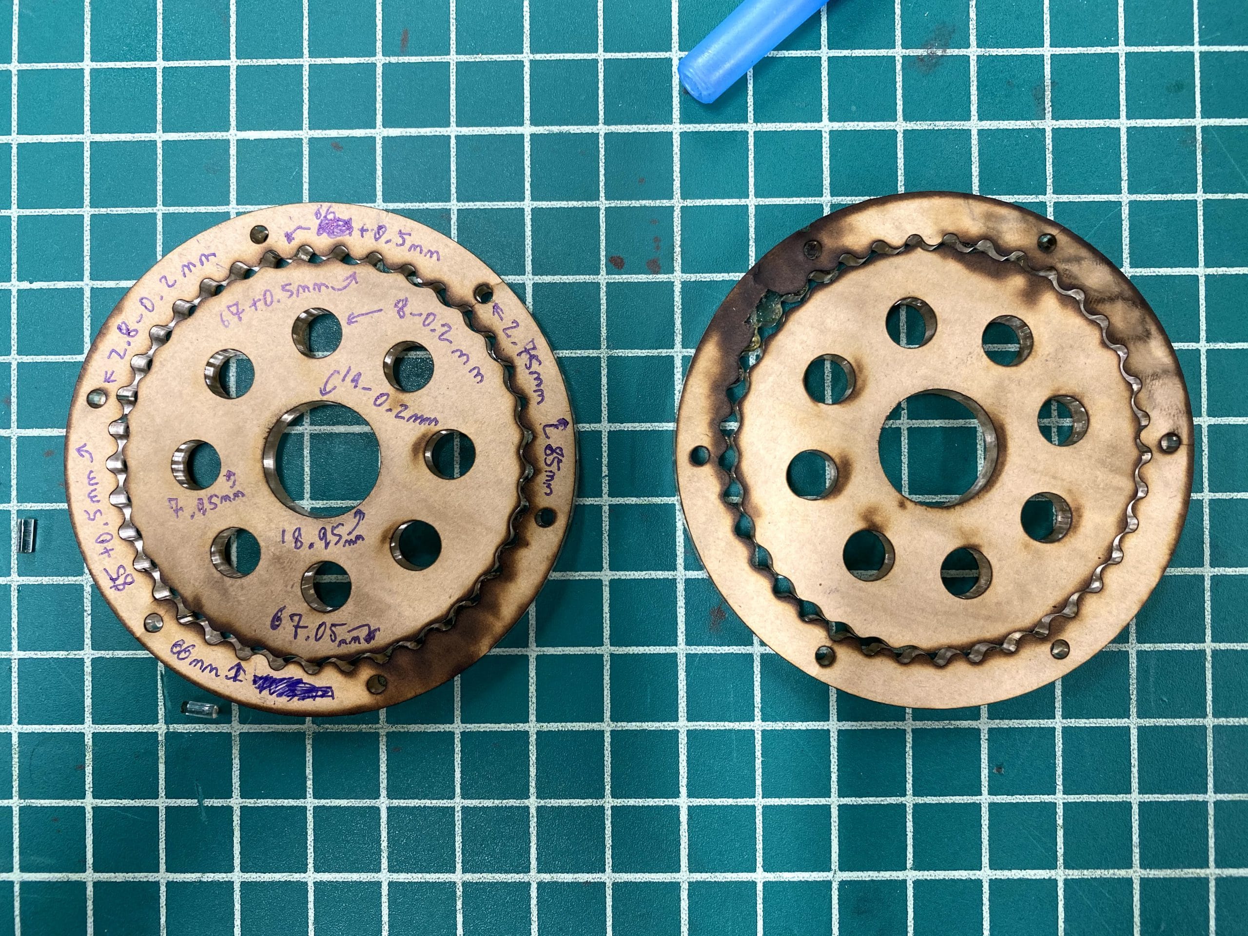 - Softening blue acrylic gears with heat to reduce the likilhood of cracking the gear while inserting the XXXX bearings with the bearing press. Using spare acrylic parts to press the bearing down evenly also reduces damage by the bearing press on the gear. Three M3 screws secure the clear acrylic outer gear to the 3D printed gearbox output (transparent and orange versions). An orange revision of the gearbox was printed but was scrapped partially due to slicer induced defects. Also pictured are a number of dimensionally inaccurate gears and a defective outer gear ring cut from a single piece of 12.80mm acrylic. Also pictured are sets of concentric rings with base diameters in increments of 5mm (20, 25, 30mm, etc) with offsets of 0.1mm (20, 25.1, 30.2mm, etc) used to identify the required offset to laser cut dimensionally accurate parts.