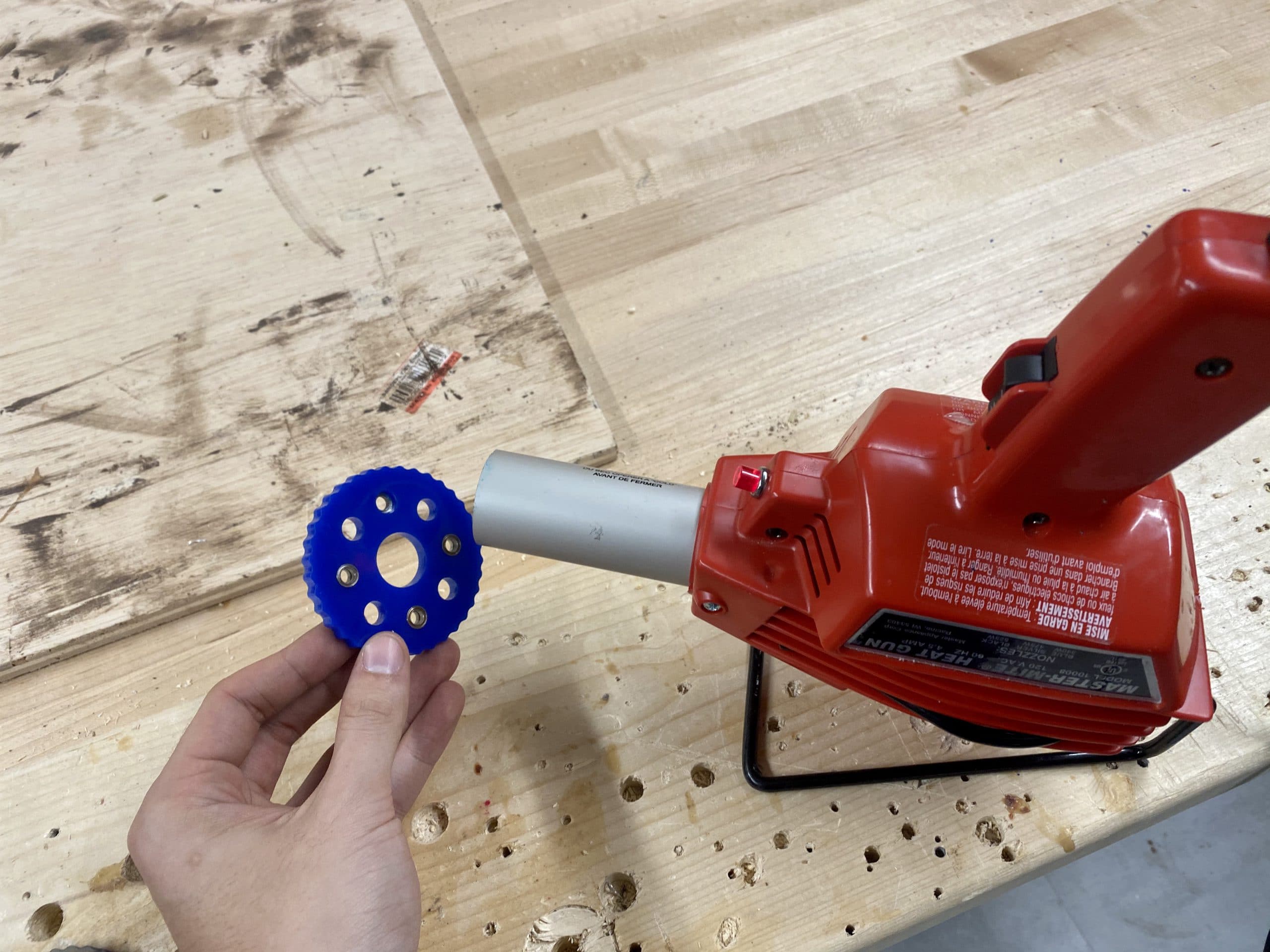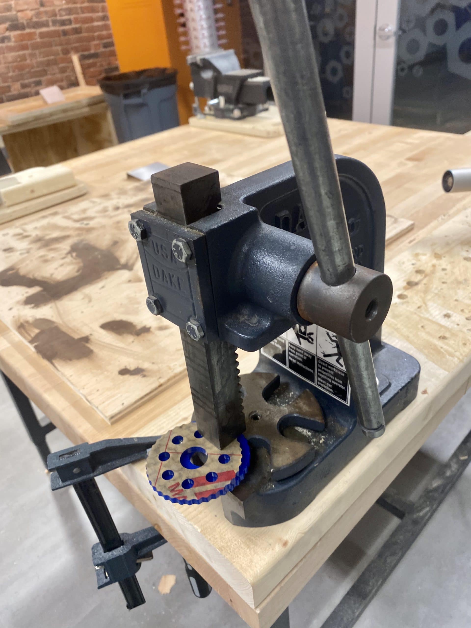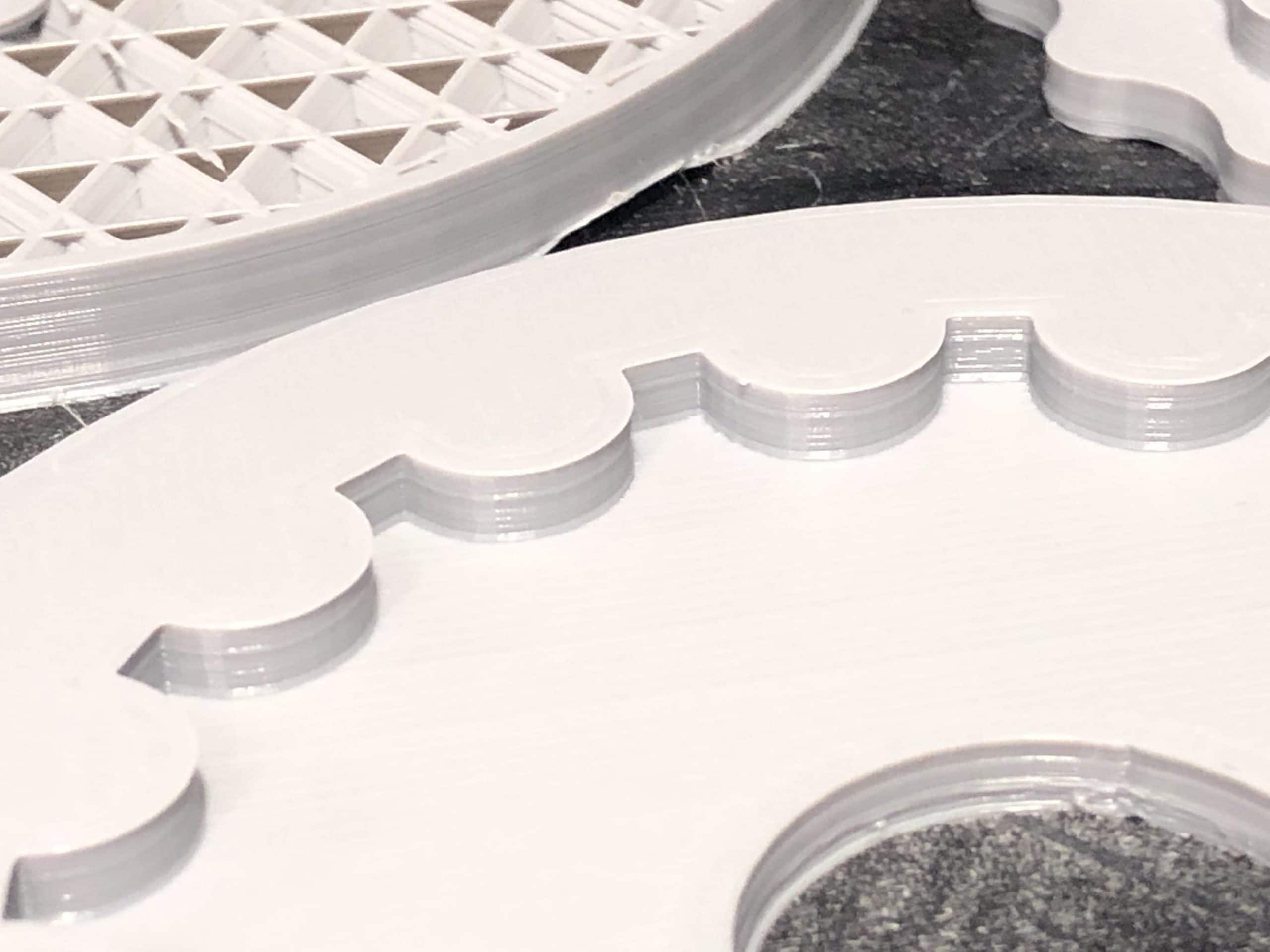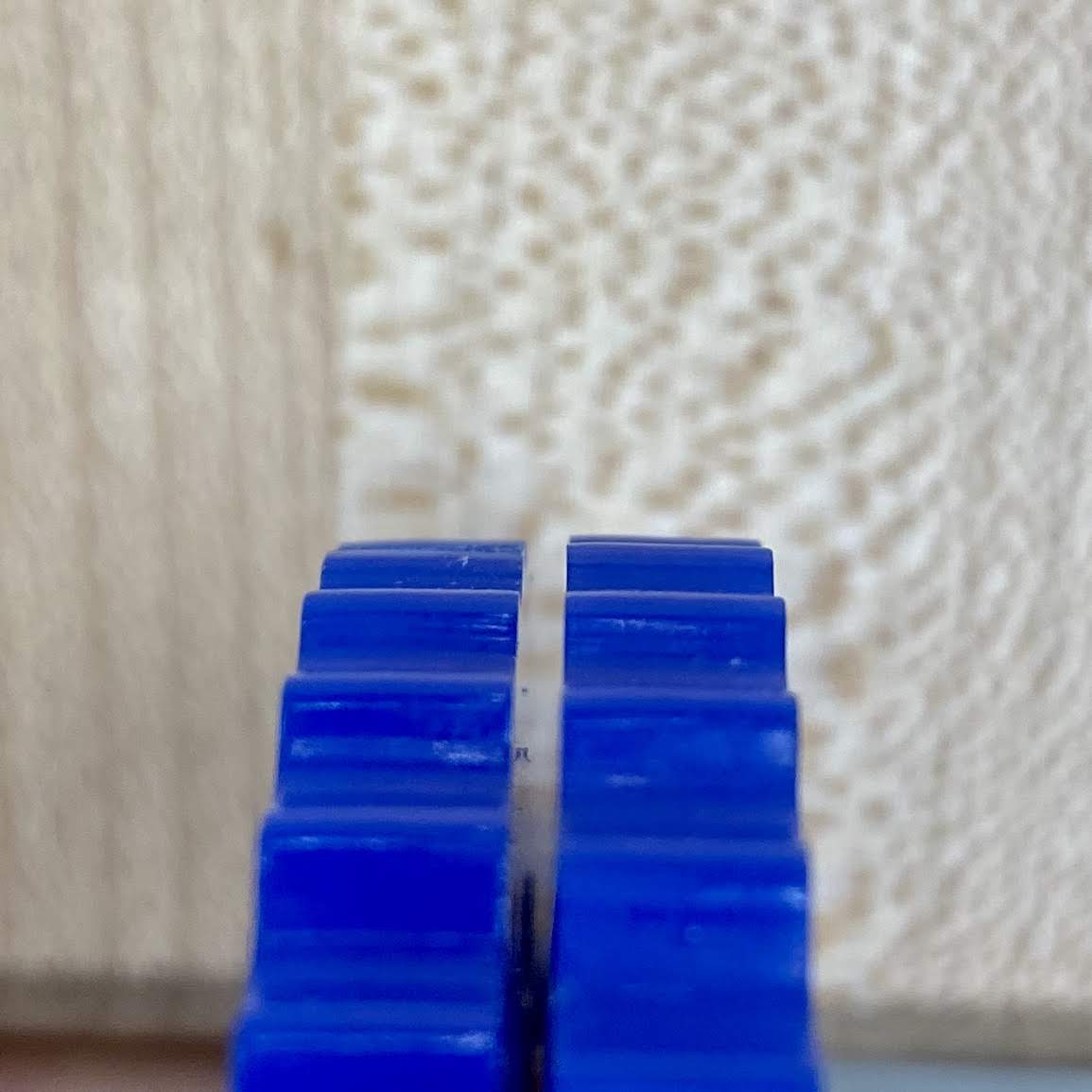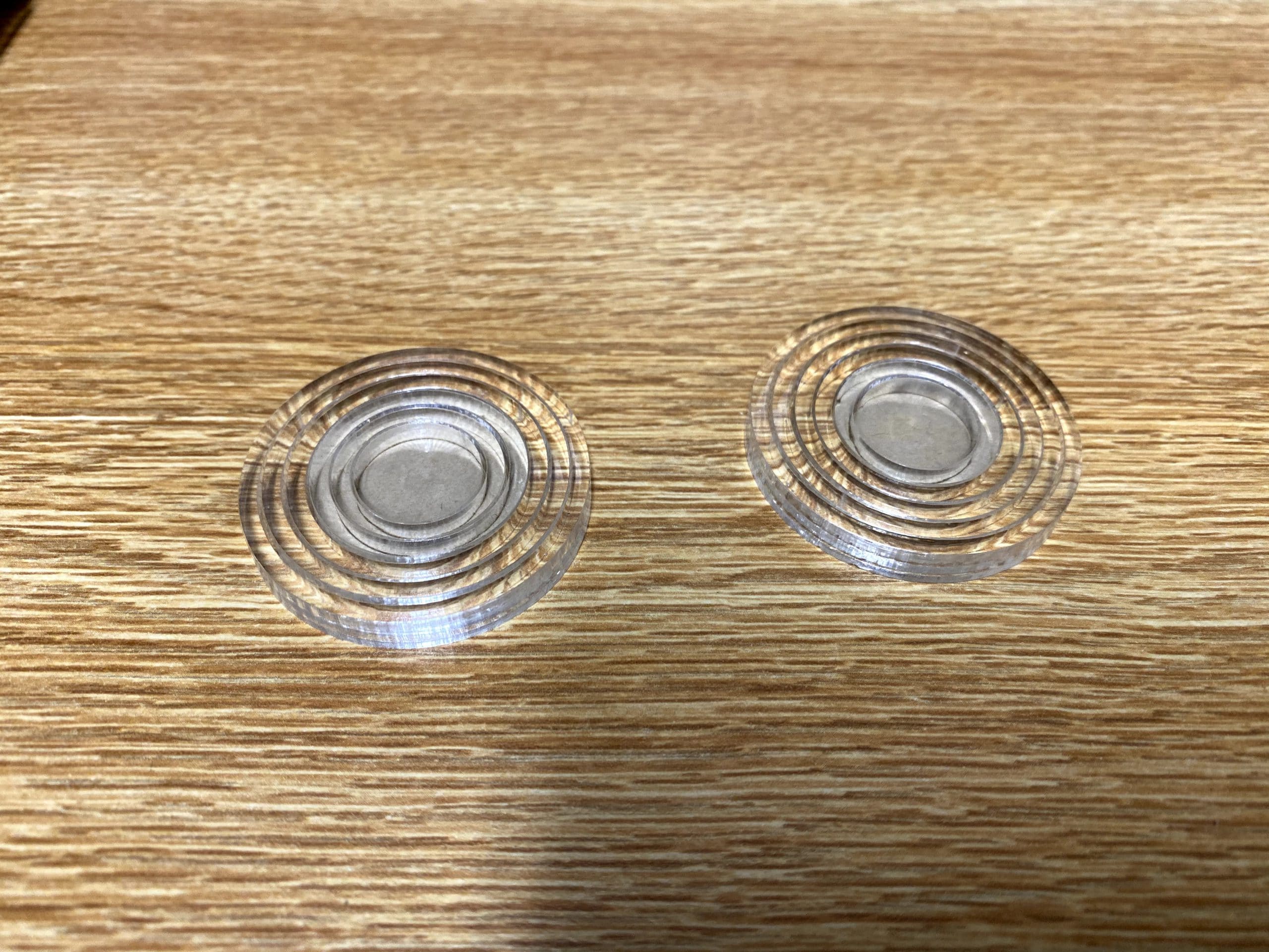 - Softening blue acrylic gears with heat to reduce the likilhood of cracking the gear while inserting the XXXX bearings with the bearing press. Using spare acrylic parts to press the bearing down evenly also reduces damage by the bearing press on the gear. Three M3 screws secure the clear acrylic outer gear to the 3D printed gearbox output (transparent and orange versions). An orange revision of the gearbox was printed but was scrapped partially due to slicer induced defects. Also pictured are a number of dimensionally inaccurate gears and a defective outer gear ring cut from a single piece of 12.80mm acrylic. Also pictured are sets of concentric rings with base diameters in increments of 5mm (20, 25, 30mm, etc) with offsets of 0.1mm (20, 25.1, 30.2mm, etc) used to identify the required offset to laser cut dimensionally accurate parts.