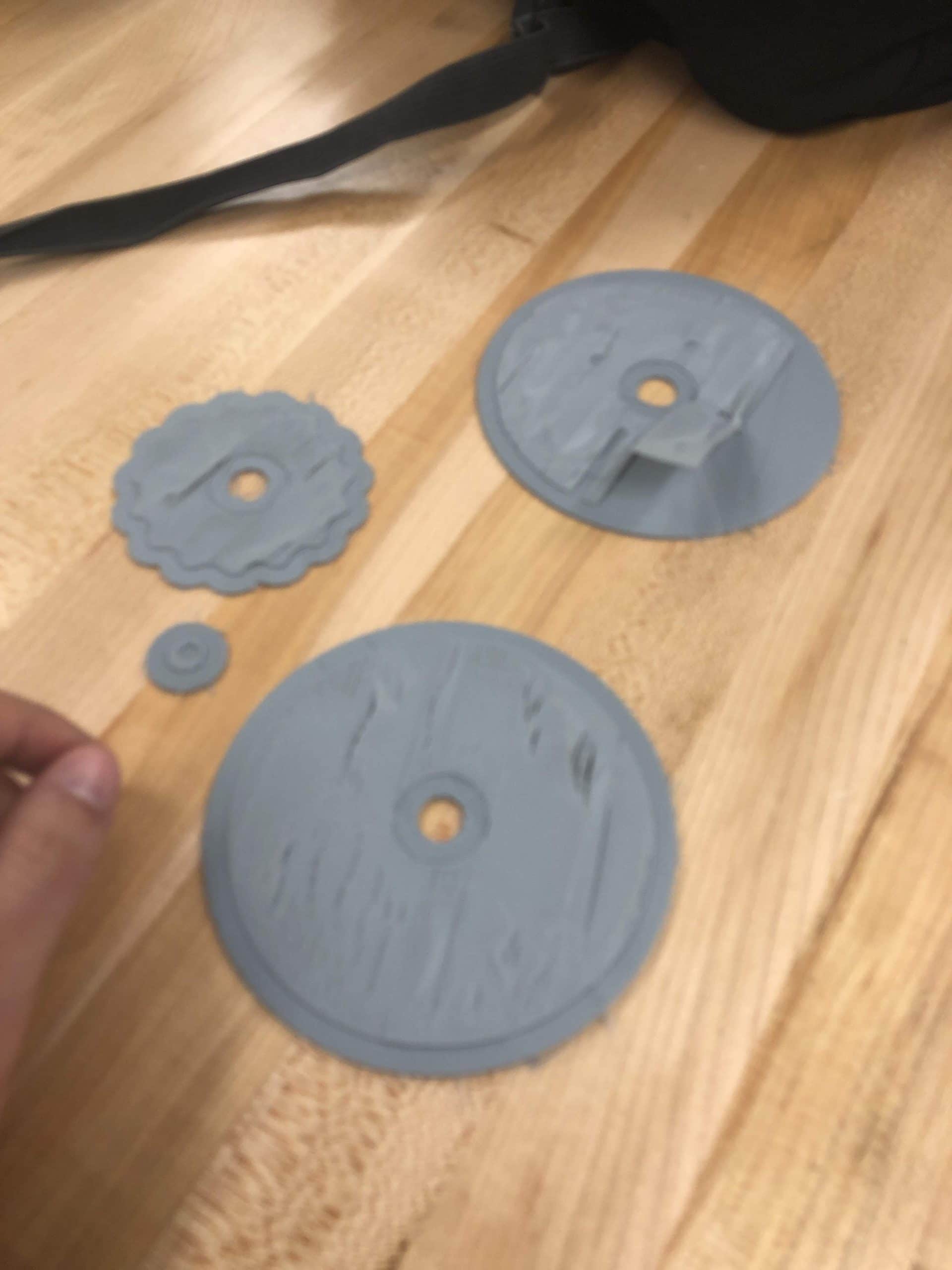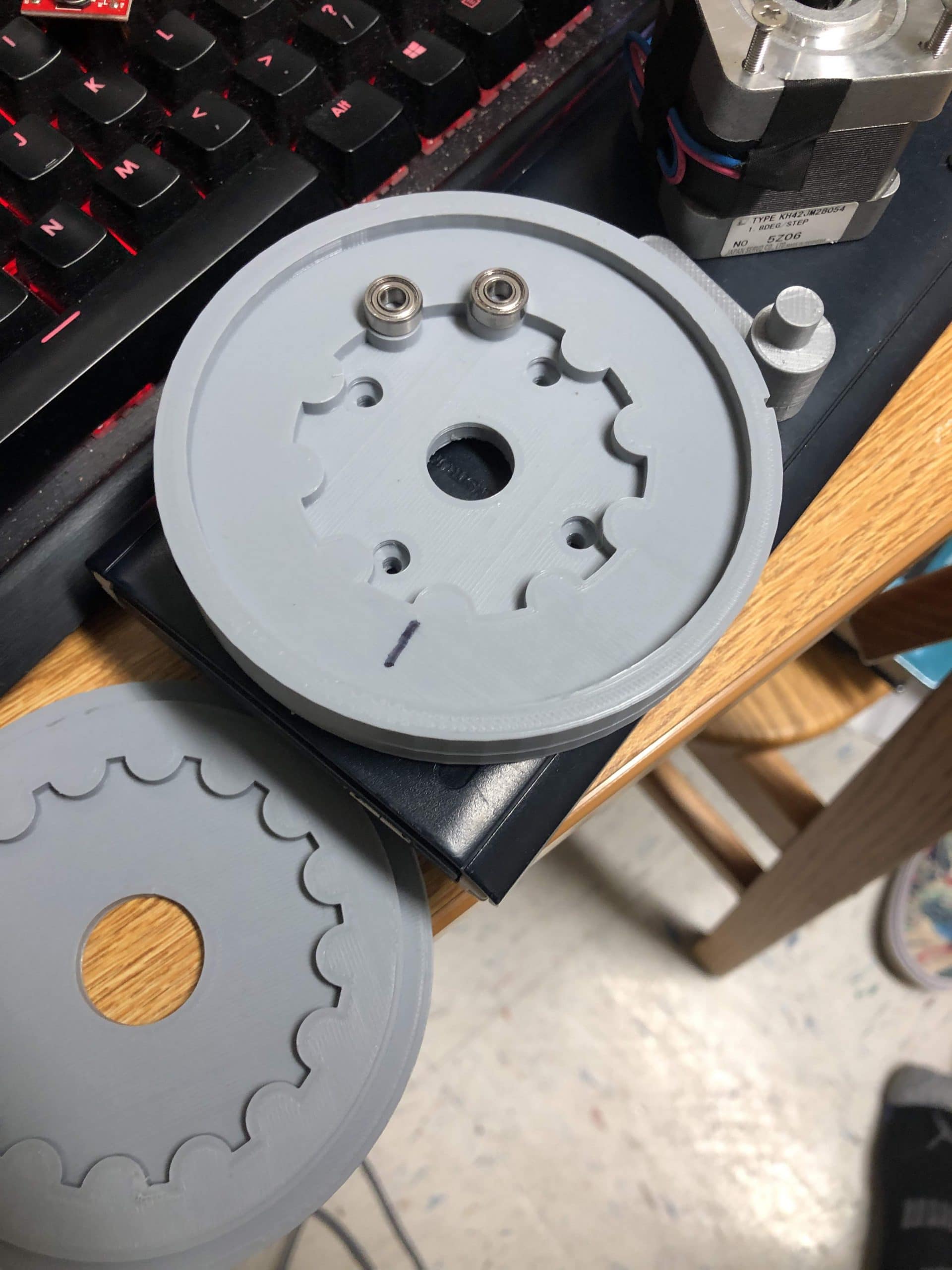 - The finished 3D print was not only difficult to separate from the printer, but also ran out of filament without stopping. As such the tallest features were cut off. However, the assembly with bearings, gears, and motor was largely a success. Although the CAM motion of this design matched the Solidworks CAM mate simulation, the printer tolerances were egregious on the gears resulting in very rigid rolling motion with a high degree of clogging.